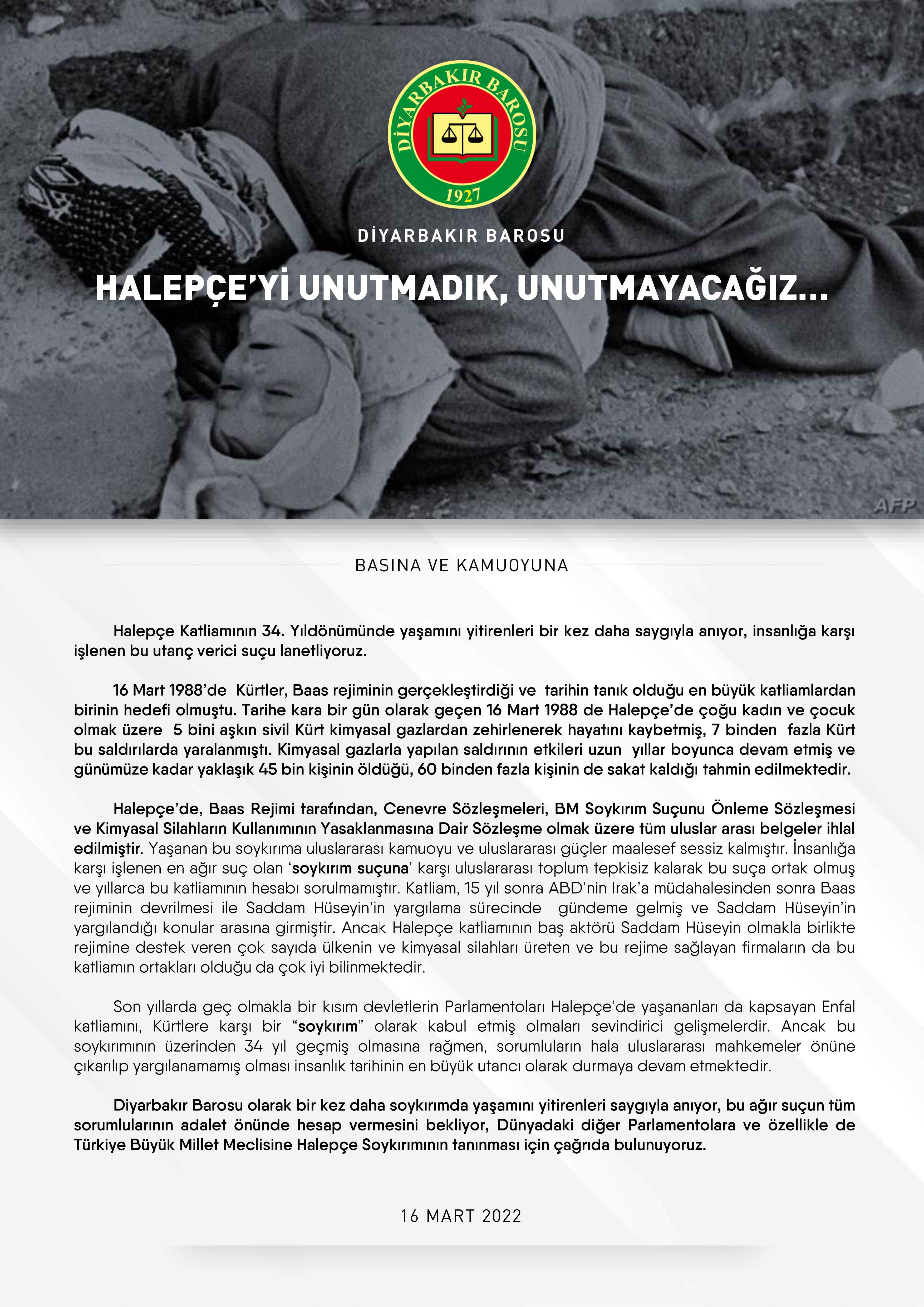 Diyarbakır Barosu olarak bir kez daha soykırımda yaşamını yitirenleri saygıyla anıyor, bu ağır suçun tüm sorumlularının adalet önünde hesap vermesini bekliyor, Dünyadaki diğer Parlamentolara ve özellikle de Türkiye Büyük Millet Meclisine Halepçe Soykırımının tanınması için çağrıda bulunuyoruz.