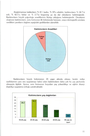 Araştırmamza katılanların % 41'i kadün, % 59'u €rkektir; katllımc arın % 54.7'si