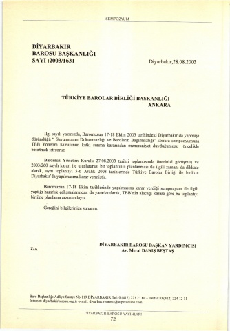 İlgi sayıIı yazınızd4 Baromuzun l7-18 Ekim 2003 tarihindeki Diyarbakır,da yapmayı