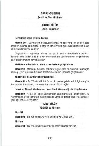 Madde 92  -  Hukuk Ve Ticaret  Mahkemeleri  Yazı  lşlerine  Ait Yönetmeliğin,  bu