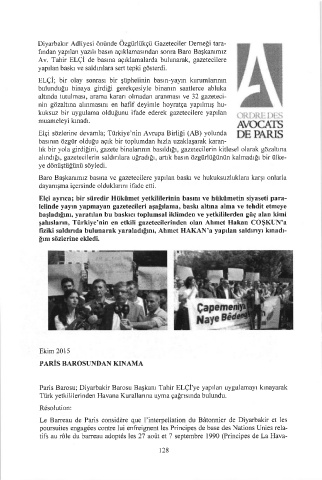 Paris Barosu; Diyarbakir Barosu Başkanı Tahir ELÇİ'ye yapılan uygulamayı kınayarak